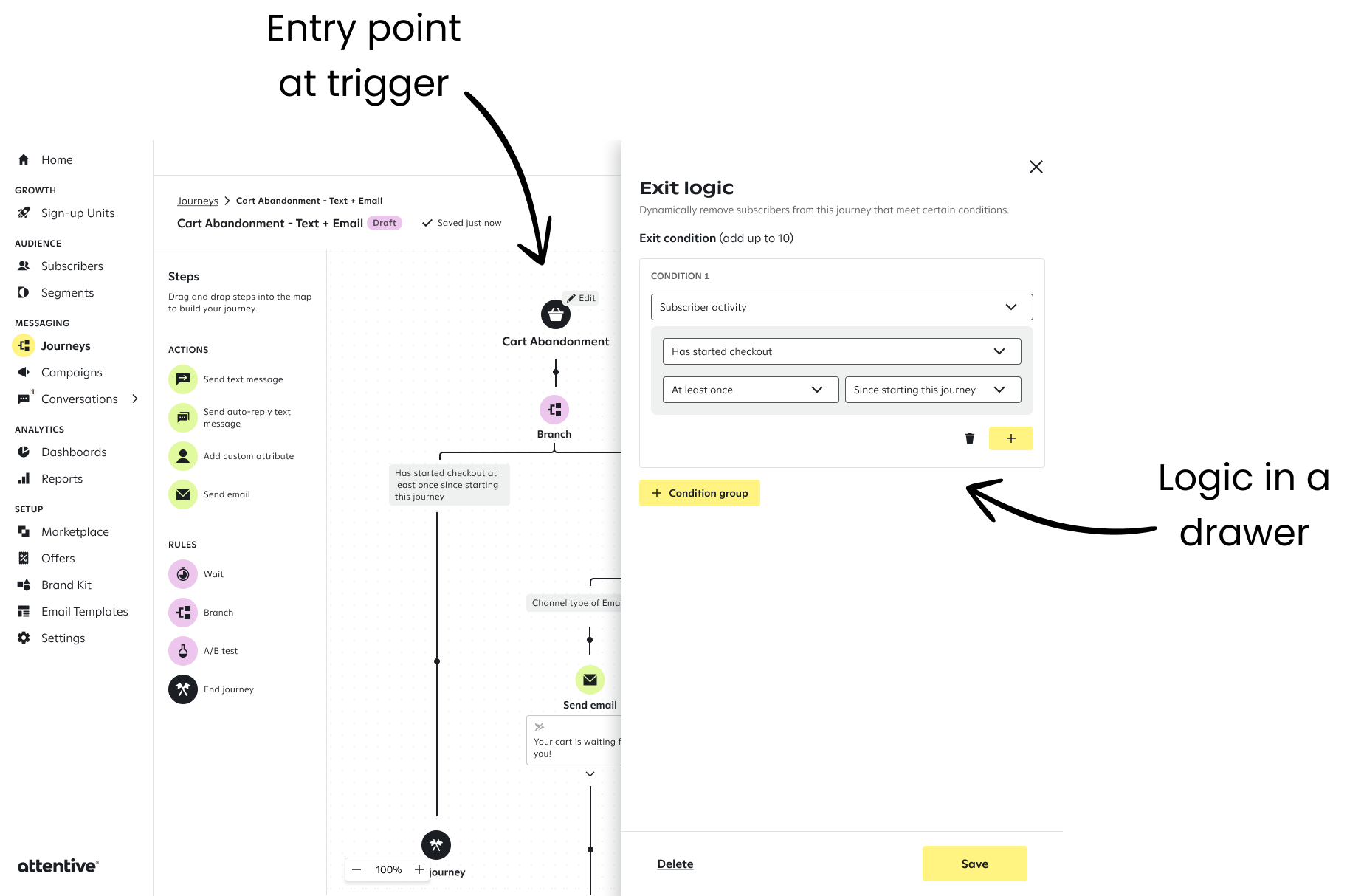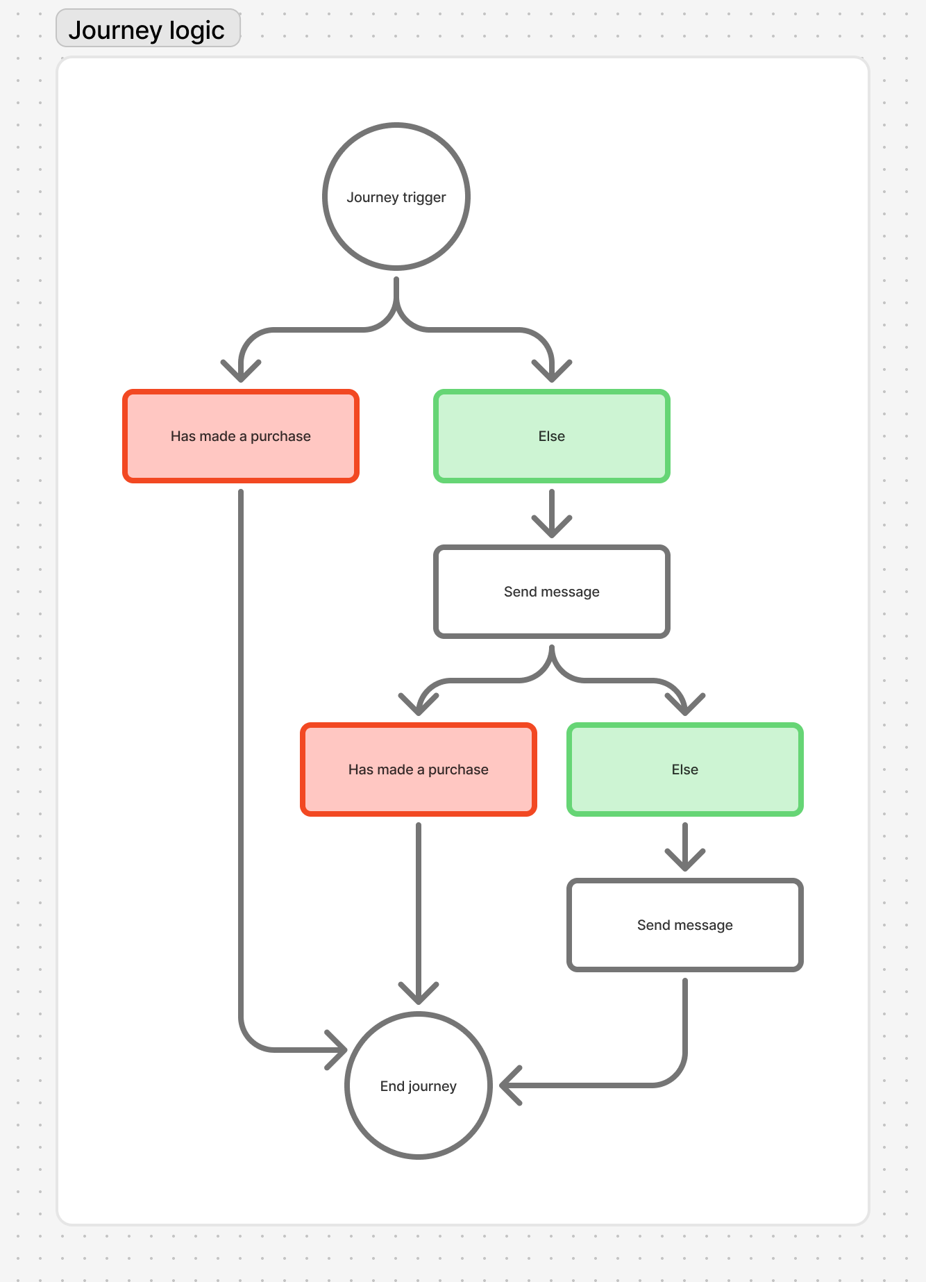 Additionally, marketers couldn't create conditions that are evaluated continuously throughout a journey. They had to manually add branches before every message to check if the action occurred.