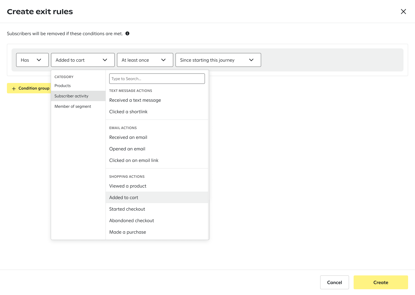 In an automated messaging flows (called "Journeys"), marketers set conditions that remove a subscriber if they become ineligible along the way — like exiting a cart abandonment flow once a purchase is made. For each branch a client created, they had to manually add an exit branch. This resulted in very bloated, repitive Journey maps that were frustrating to navigate.